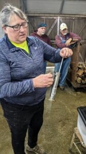 Barb testing before putting maple syrup into the jugs.