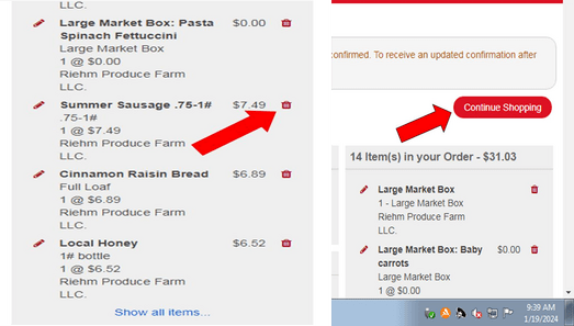 Add items to your box by clicking the red “Continue Shopping” button at the top of the page to reach your subscription amount.